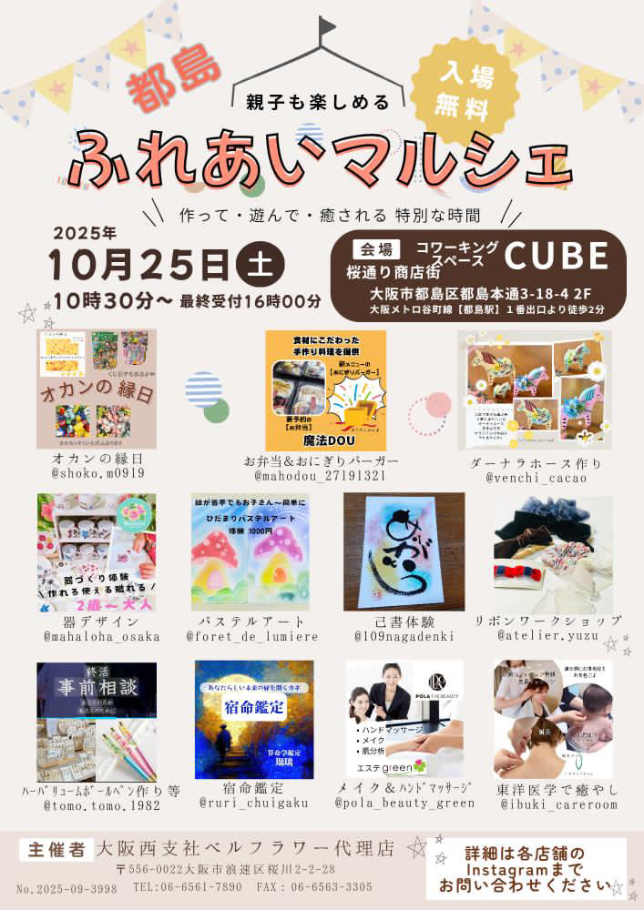 2025.10.03 10/25(日)「都島ふれあいマルシェ」が開催されます! 大阪西支社ベルフラワー代理店様主催、なんと入場は無料です!ワークショップやフードなど、親子でも楽しめるマルシェです♪ 10/21(火)「アロマスプレー作...