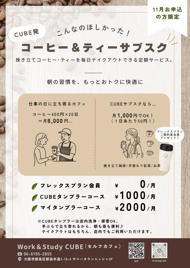 挽き立てコーヒー・月替わり紅茶・お茶を毎日テイクアウトできる定額サービスを始めました!